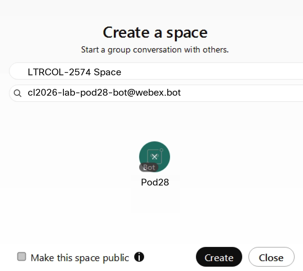 which will create a username of cl2026-lab-pod28-bot@webex.bot